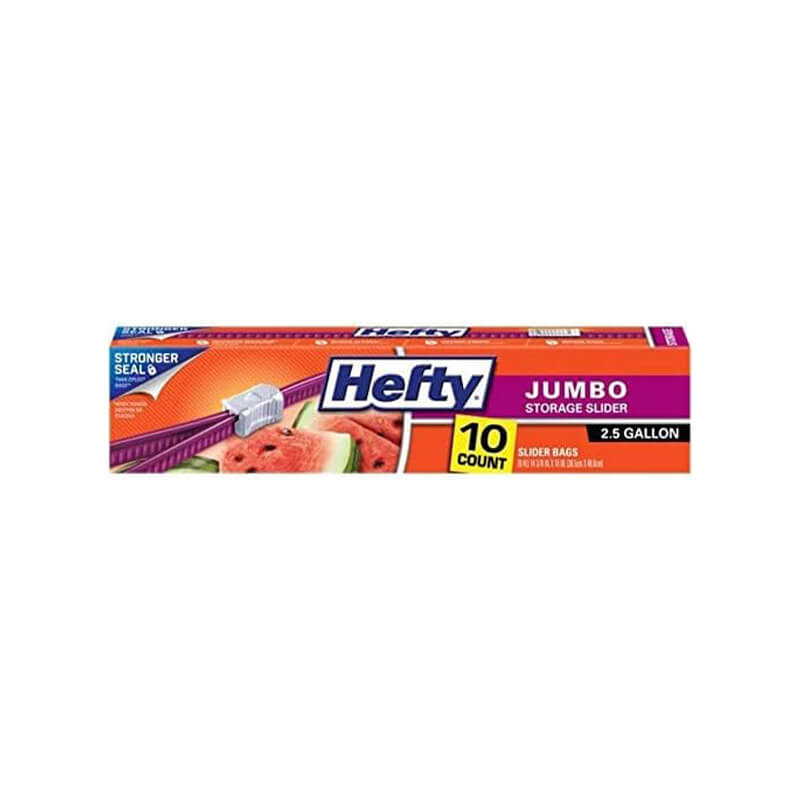 Get a better bang for your buck and toughness you can trust with these Hefty Slider Jumbo Storage Bags. The patented MaxLock track & Clicks-Closed feature lets you know when these BPA-free plastic food bags are securely closed. The stand-and-fill expandable bottom makes it easy to load food, craft supplies or other household items into these plastic storage bags. Large write-on labels let you identify and organize the contents of each of these slider bags in your fridge, freezer or closet. Take these storage bags with you on-the-go; use them as an alternative to packing cubes when traveling, camping or moving to stay organized and keep your clothing protected from spills and moisture.