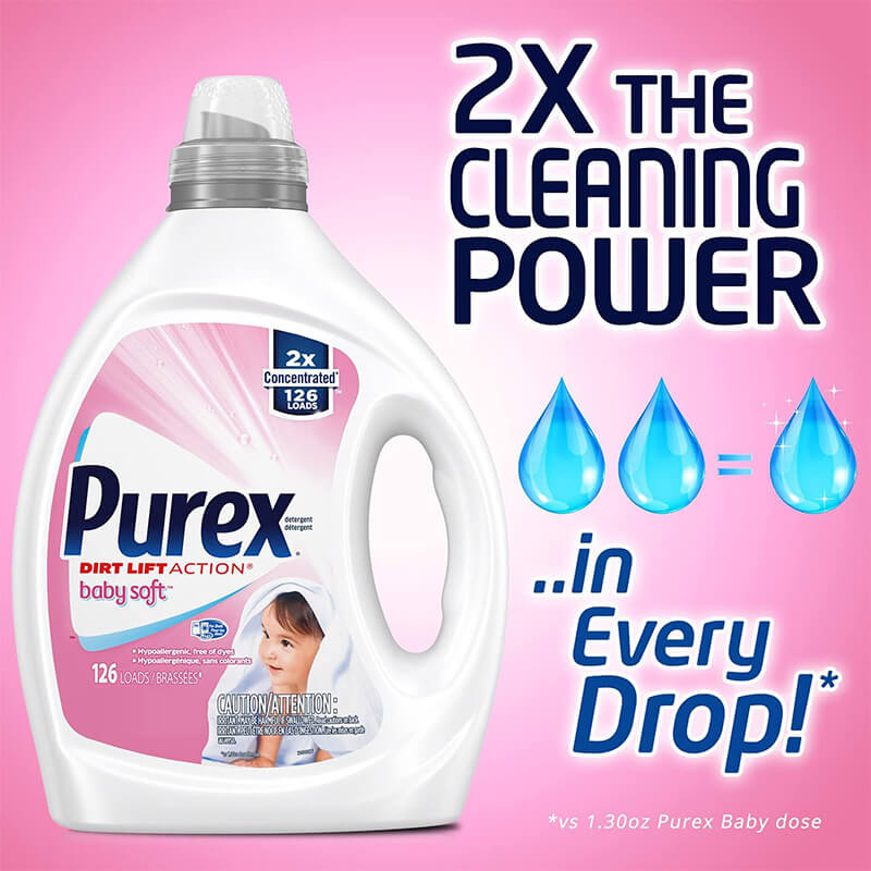 You want the best for your baby, and so do we. Purex Baby Laundry Detergent is hypoallergenic, dermatologist-tested and formulated to be extra gentle on your little one’s sensitive skin. This concentrated formula delivers 2X more cleaning power in every drop vs our standard Purex liquid detergent so you only need to use half as much to leave your baby’s clothes fresh and clean with a soft baby scent. For the value, quality and gentle care of your little one – the price can’t be beat!